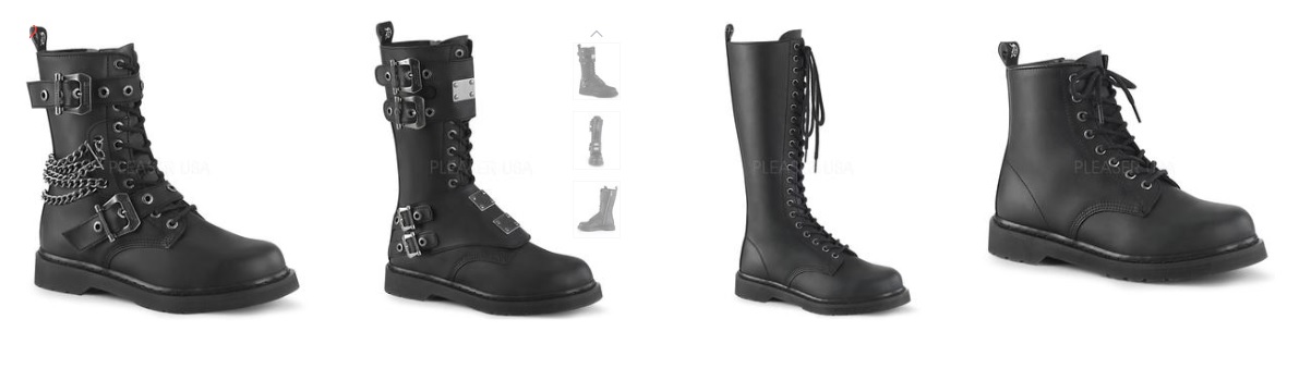 mixture of a combat boot and the old school lace ups we lived in during our teens each pair has their own little bit of brilliance. Chains and straps for a classic punk look, more grommets and metal plates.