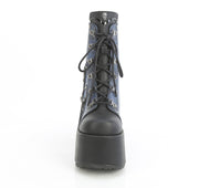 Additonal Description: 5" ChunkyHeel, 3" PF. 5" (127mm) Chunky Heel, 3" (75mm) Platform D-Ring Lace-Up Dront Ankle Boot Featuring Moonlit Cathedrial Printed Artwork & Charm Detail, Metal Back Zip Closure