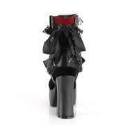 Additonal Description: 4 1/2" Heel, 2" Platform. 4 1/2" (114mm) Block Heel, 2" (51mm) Platform Ankle Boot Featuring Front & Back Satin Ribbon Lace-Up Details and Ruffled Ankle Strap w/ Hanging Chain Detail, Inner Side Zip Closure
