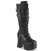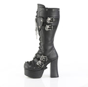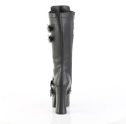 Additonal Description: 4 1/2" Heel, 2" Platform. 4 1/2" (114mm) Block Heel, 2" (51mm) Platform Lace-Up Front Knee High Boot, Featuring Metal Skull W/ Hanging Chain Details on Skull Buckled Shield & Skull Double Buckle Straps w/ Hanging O-Ring Connecting at Center, Inside Metal Zip Closure
