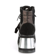 Additonal Description: 3 1/2" Platform. 3 1/2" (89mm) Front & Back Metal Plated Platform Lace-Up Ankle Boot w/ Grommet Buckle Strap and an Oversize Grommet on Tongue