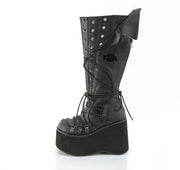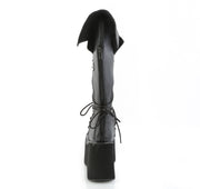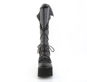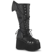 Additonal Description: 4 1/2" Platform. 4 1/2" (114mm) Platform Knee High Boot Featuring Ornamental D-Ring Lacing, Collar & Cone Spike Stud Details Along with Front Gusset Stretch Detail in Front, Full Length Inner Side Metal Zip Closure