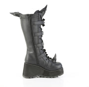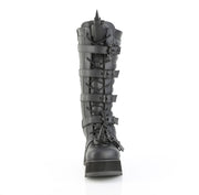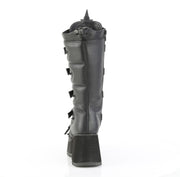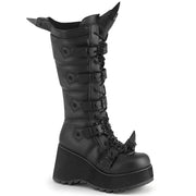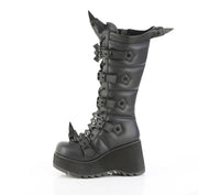 Additonal Description: 3 1/2" Platform. 3 1/2" (89mm) Platform Lace-Up Knee High Boot Featuring Eyeleted Centered Bat Buckle Straps & Rubber Spiked Rhino Horn Detail on the Toe, Upper Back & Tongue, Full Length Inner Side Metal Zip Closure
