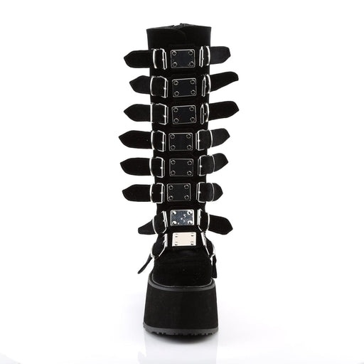 DAMNED 318 Black Velvet Platform Knee High Boot with 8 Buckle Straps,Back Metal ZipDetails: 3 1/2 Inch Platform Brand: Demonia.