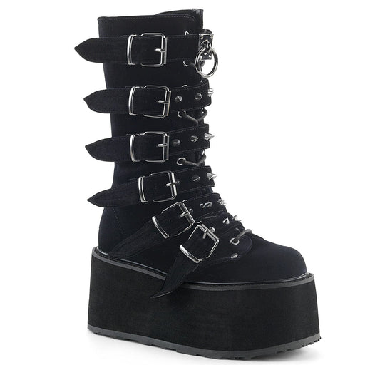 DAMNED 225 Black Velvet Platform Mid-Calf Boot with 6 Buckle Straps, Metal Side ZipDetails: 3 1/2 Inch Platform Brand: Demonia.