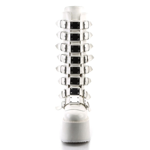 DAMNED 318 White Vegan Leather Platform Knee High Boot with 8 Buckle Straps, Back Metal ZipDetails: 3 1/2 Inch Platform Brand: Demonia.