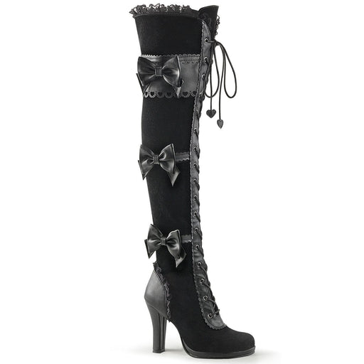 GLAM 300 Black Vegan Leather-Velvet Platform Goth Lolita Over-the-Knee Boot with BowsDetails: 3 3/4 Inch Heel, 1/2 Inch Platform Brand: Demonia.