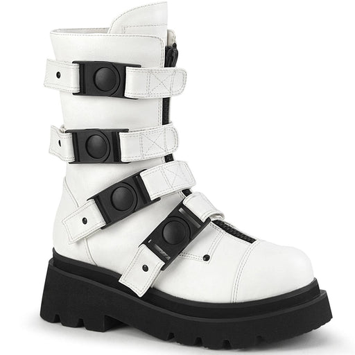 SLACKER 160 White Patent Platform Mid-Calf Boot with 5 Buckle Straps, Outside ZipDetails: 2 Inch Platform Brand: Demonia.