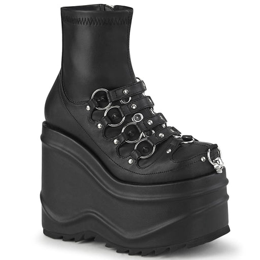 WAVE 110 Black Stretch Vegan Leather Wedge Platform Stretch Ankle Boot, Inside ZipDetails: 6 Inch Wedge Platform Brand: Demonia.