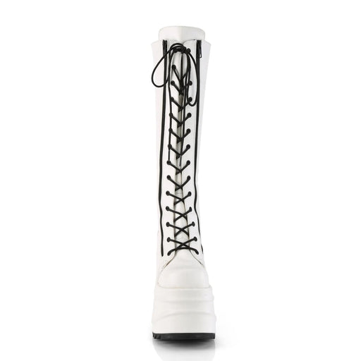 WAVE 200 White Vegan Leather Wedge Platform Lace-Up Knee High Boot, Back Metal ZipDetails: 6 Inch Wedge Platform Brand: Demonia.