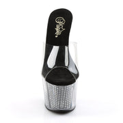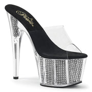 Additonal Description: 7" Heel, 2 3/4" Platform. 7" (17.8cm) Stiletto Heel, 2 3/4" (7cm) Platform Slide Featuring Chrome Plated, Simulated Rhinestone Filled Bottom
