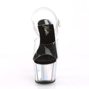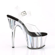 Additonal Description: 7" Heel, 2 3/4" Platform. 7" (178mm) Heel, 2 3/4" (70mm) Platform Ankle Strap Sandal Featuring Holographic Inserts in the Platform Bottom