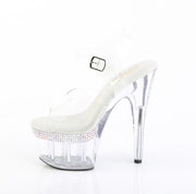 Additonal Description: 7" Heel, 2 3/4" PF. 7" (178mm) Heel, 2 3/4" (70mm) Platform Ankle Strap Sandal Featuring AB Rhinestones Encrusted on Platform Top Edge and Back of the Heel