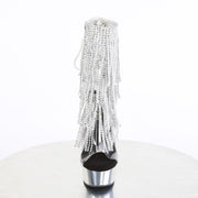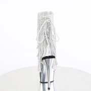 Additonal Description: 6" Heel, 1 3/4" Platform. 6" (15.2cm) Stiletto Heel, 1 3/4" (4.5cm) Platform Open Toe/Heel Back Lace-Up Ankle Boot Featuring Chrome Plated Platform & 4-Layer Chrome Plated, Simulated Rhinestone Fringe, Inner Side Zip Closure