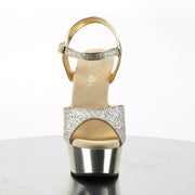 Additonal Description: 6" Heel, 1 3/4" Platform. 6" (15.2cm) Stiletto Heel, 1 3/4" (4.5cm) Chrome Plated Platform Peep Toe Ankle Strap Sandal Featuring Glittered Upper