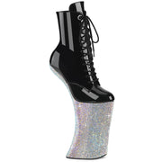 Additonal Description: 11" Heelless, 6 1/4" Platform. 11" (279mm) Heelless, 6 1/4" (160mm) Platform Lace-Up Front Ankle Boot Featuring Rhinestones Encrusted All-Over the Entire Platform Bottom, Inner Side Zip Closure. **WARNING: Extreme Height & Heelless Design. Not Recommended for Walking or Dancing.