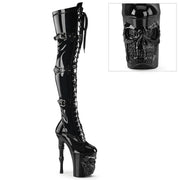 RAPlatformURE 3028 Black Stretch Patent/Black Skull Platform Thigh Boot, Inside Zip
