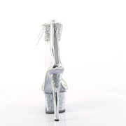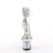 Additonal Description: 7" Heel, 2 3/4" Platform. 7" (178mm) Heel, 2 3/4" (70mm) Platform Close Back Ankle Cuff Sandal w/Side Lacing Featuring Silver Multi Rhinestone Embellished Ankle Cuff & Toe Strap and Inserted in the Platform Bottom, Back Zip Closure