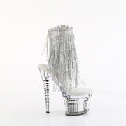 Additonal Description: 7" Heel, 3" Textured Platform. 7" (178mm) Heel, 3" (76mm) Textured Platform Open Toe/Heel Lace-Up Back Ankle Boot Featuring 4-Layer Chrome Plated Simulated Rhinestone Fringe, Inner Side Zip Closure