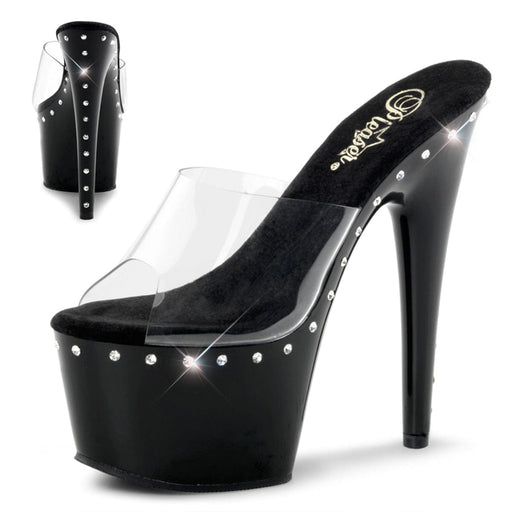 ADORE 701LS Clear/Black Platform Slide Featuring 1 Line R/S On Platform And HeelDetails: 7 Inch Heel, 2 3/4 Inch Platform Brand: Pleaser.