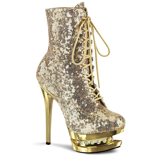 BLONDIE R 1020 Gold Sequins/Gold Chrome Platform Lace-Up Sequined Ankle Boot, Side ZipDetails: 6 Inch Heel, 1 1/2 Inch Platform Brand: Pleaser.