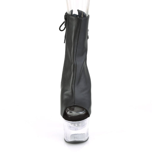 View full detailsFLASHDANCE 1018 7 Black Faux Leather/Clear Platform LED Illuminated Open Ankle Boot, Side ZipDetails: 7 Inch Heel, 2 3/4 Inch Platform Brand: Pleaser.