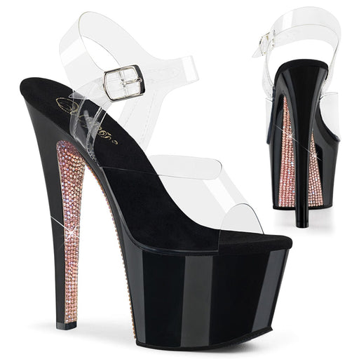 View full detailsSKY 308CRS Clear/Black-Champagne AB Rhinestones Platform Ankle Strap SandalDetails: 7 Inch Heel, 2 3/4 Inch Platform Brand: Pleaser.