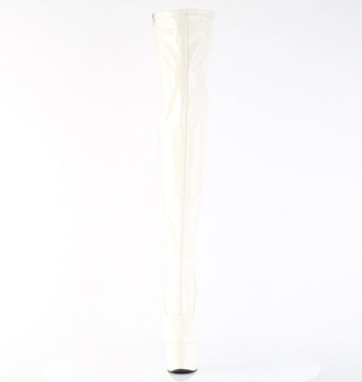 SPECTATOR 3030 White Faux Leather/Clear-White Matte Textured Platform Lace-Up Back Thigh Boot, Side ZipDetails: 7 Inch Heel, 3 Inch Textured Platfo...
