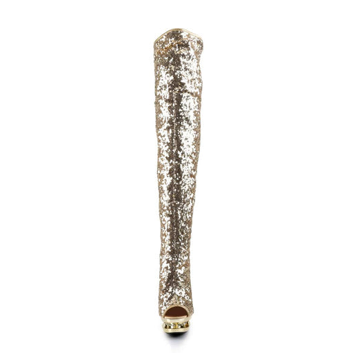 BLONDIE R 3011 Gold Sequins/Gold Chrome Dual Platform Open Toe Thigh BootDetails: 6 Inch Heel, 1 1/2 Inch Platform Brand: Pleaser.