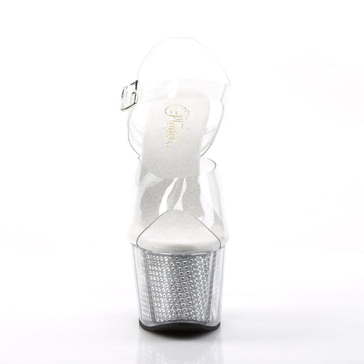 View full detailsADORE 708SRS Clear/Silver Simulated Rhinestones Platform Sandal with Simulated Rhinestone Filled BottomDetails: 7 Inch Heel, 2 3/4 Inch Platform Br...