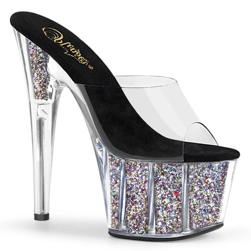 ADORE 701CG Clear/Silver Confetti Glitter Platform Slide with Glitter InsertsDetails: 7 Inch Heel, 2 3/4 Inch Platform Brand: Pleaser.