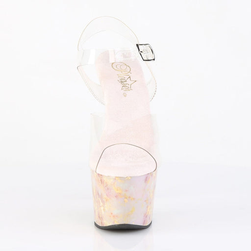 ADORE 708MB Clear/Blush-Gold Marble Platform Ankle Strap SandalDetails: 7 Inch Heel, 2 3/4 Inch Platform Brand: Pleaser.