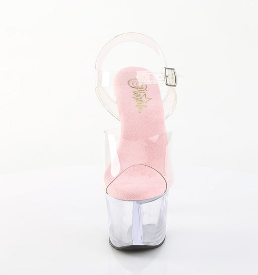 SKY 308 Clear/Baby Pink Chrome Chrome Plated Platform Ankle Strap SandalDetails: 7 Inch Heel, 2 3/4 Inch Platform Brand: Pleaser.